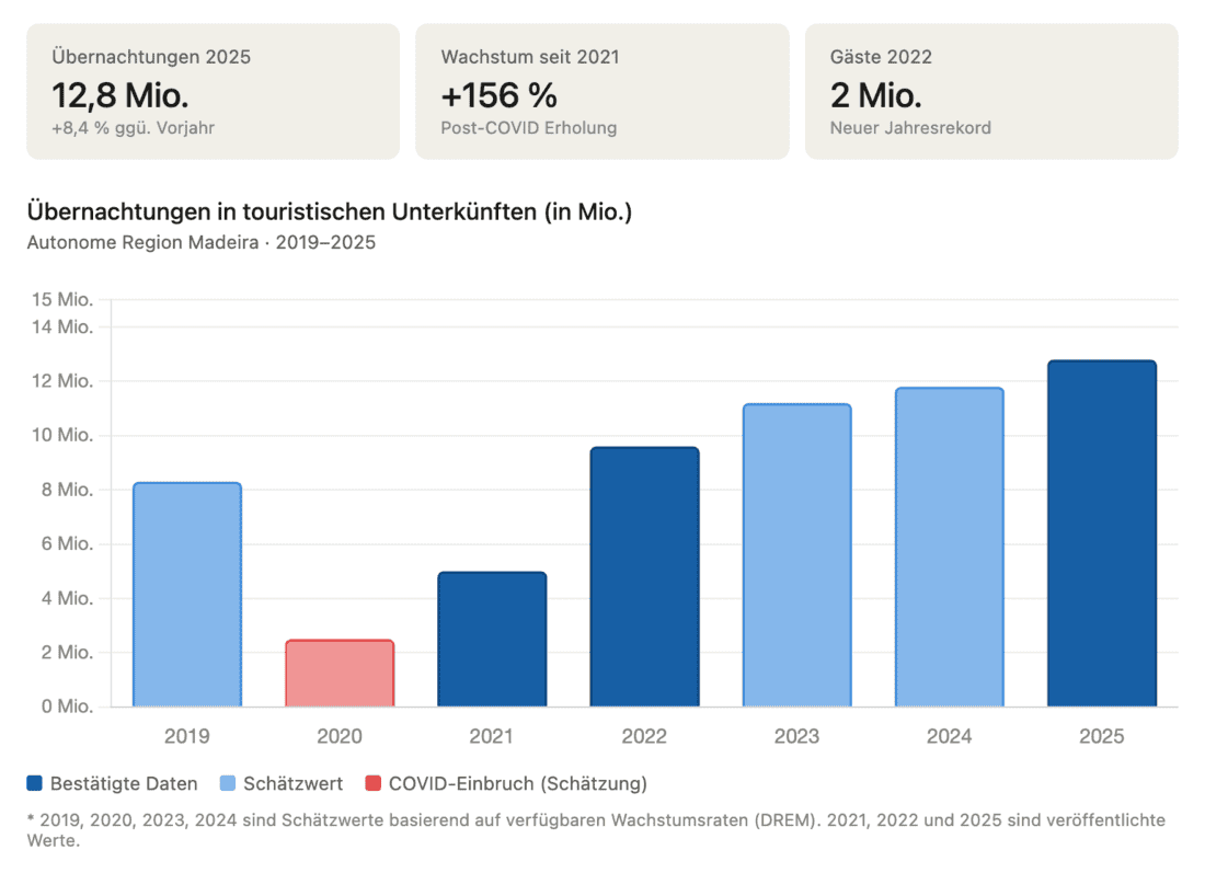 Der Tourismus boomt: Im Jahr 2025 stiegen die Übernachtungen in den touristischen Unterkünften der Autonomen Region Madeira um 8,4 % und näherten sich damit fast 12,8 Millionen. Im Jahr 2022 zählte Madeira bereits zwei Millionen Gäste. Angesichts dieses starken Wachstums steuert die Regionalregierung nun aktiv gegen: Um Madeira als Qualitätsdestination zu erhalten und einen Übergang in den Massentourismus zu verhindern, wurde eine Bettenobergrenze eingeführt. Bestehende Beherbergungsbetriebe dürfen maximal 40.000 Betten anbieten, und neue Hotels erhalten nur dann eine Genehmigung, wenn sie die Obergrenze von 80 Zimmern beziehungsweise 160 Betten nicht überschreiten.